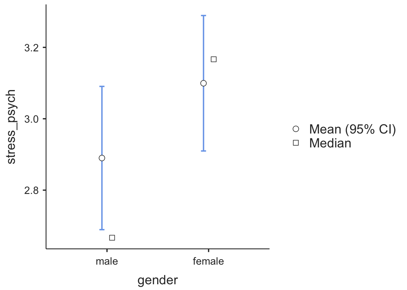 Again, different alternative hypotheses can be specified. For directional hypotheses (one-sided tests), the order of the factor levels has to be considered. For example, if we assume that girls will report a higher level of psychological stress symptoms than boys and the factor gender